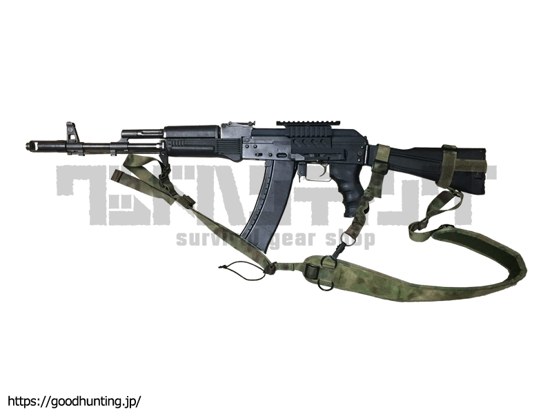 ロシア StichProfi社製のAK用3点式タクティカルスリングです。素早い長さ調整機能と絡まり防止機構を備えています。3点で支えていますが取り回しは2点式に近いです。